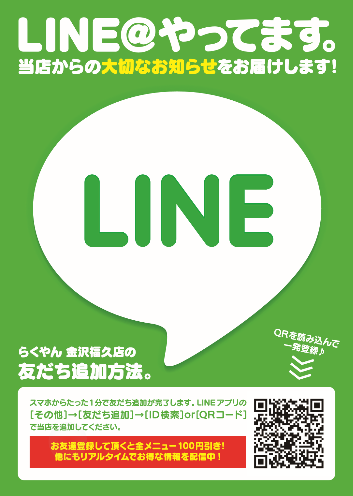 QRコードを読み込むか、ラインの公式アカウント「らくやん」を検索で登録完了!